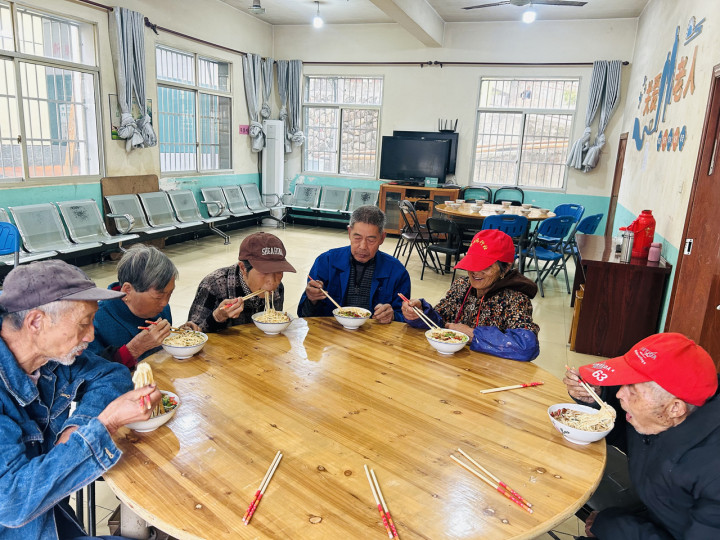 老人在淳安县左口乡方家村老年食堂吃面受访者供图